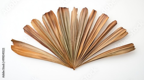 Dried palm tree leaf arranged in a fan shape set against a white background