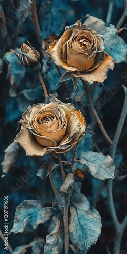 rose, flower, leaf, stem, plant, bloom, blossom, botany, nature, autumn, fall, season, colours, gold, teal, blue, green, brown, texture, detail, art, design, image, photo, picture, background, aesthetic, beauty, elegance, vintage, old, withered, faded, dry, closeup, macro, romantic, sombre, moody, dark, light