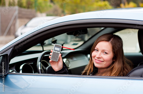 drink and drive young female driver being subject to test for alcohol content with use of breathalyzer. she is smiling as she does not drive and drink