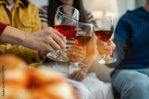 drinks and conversation, social gathering and get together. Young people, group and happiness at fast food pizzeria, celebration at home.