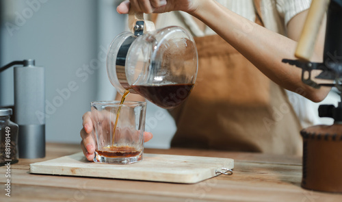 drip coffee, woman making drip coffee by pouring spills hot water on coffee ground with prepare filter from copper pot to glass transparent chrome drip maker on wooden table.