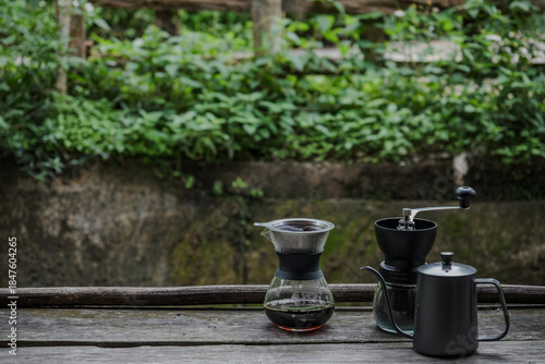 dripping coffee set in countryside village with wooden branch in background