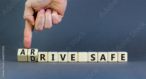Drive and arrive safe symbol. Concept words Drive safe Arrive safe on wooden blocks. Beautiful grey table grey background. Businessman hand. Business drive and arrive safe concept. Copy space.