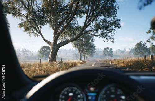 road, car, driving, country, scenic, tree, landscape, sun, vista, view, nature, travel, journey, morning, day, foggy, countryside, grass, field, asphalt, eucalyptus, calm, peaceful, vehicle, horizon, sunrise, sunset, light, colours, digital, image, simulation, game, realistic, sharpened, dashboard, steering, speedo, sunlight, weather, fog, gold, golden hour, rural