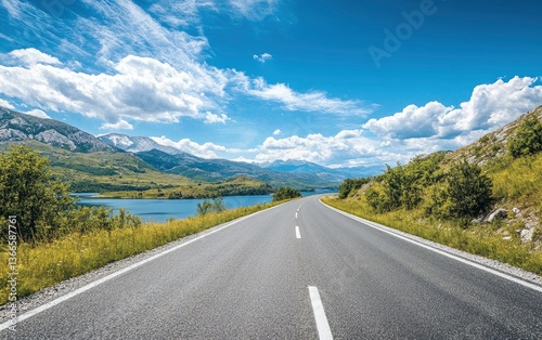 road, driving, landscape, mountain, lake, sky, cloud, hill, asphalt, pavement, roadside, vegetation, grass, tree, shoreline, daytime, day, scenic, travel, tour tourism, transport, horizon, distance, open, route, destination, journey, adventure, summer, environment, serene, nature, tranquil, straight, winding, passing, clear, blue