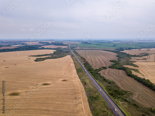 Drone aerial view of BR 373 road and farm field cultivated with soybean in rural area of Paraná state, Brazil, on summer day. Concept of agriculture, farming, ecology, food, work, economy, industry.