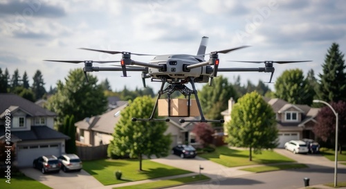 drone, delivery, package, flying, technology, aerial, innovation, future, transport, service, fast, shipping, autonomous, robot, air, vehicle, cargo, express, logistic, remote, control, rotor, propeller, neighbourhood, house, suburb, tree, sky, cloud, lawn, street, car, mail, box