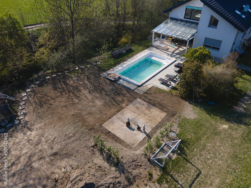 Drone flight over fresh earth area with grass grown next to pool construction site in April