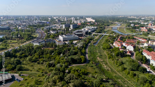 Drone panorama of green areas, modern architecture and river in Poznan
