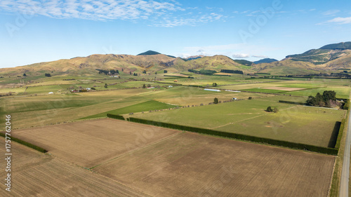 Drone perspective of vast area agriculture and farm land in the heartland of the South Island NZ