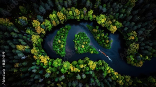 Drone Photography The winding path of a river through a dense forest, viewed from above, a metaphor for lifes journeys