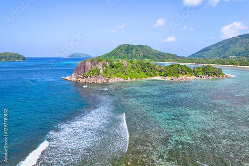 Drone shot of port glaud beach, island in the foreground, coral reef barrier, granite stones, white sandy beach and clear turquoise water, Mahe, Seychelles. 1