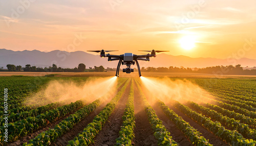 Drone Spraying a Field: A modern drone meticulously sprays a field of crops under a warm sunset, capturing the essence of precision agriculture