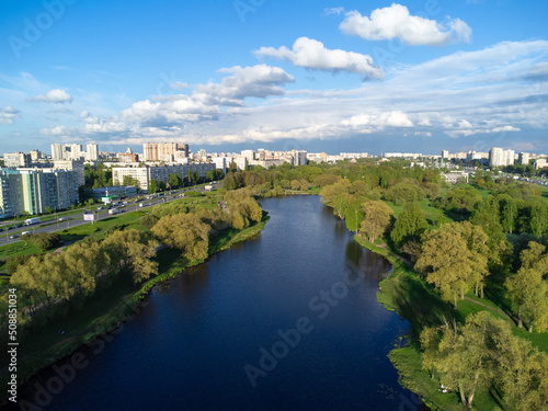 tree, path, green, landscape, park, nature, view, drone, water, lake, top, duck pond, sky, day, duck pond, scene, pathway, urban, city, up high, road, sunlight, paseo, bridge, footpath, sunny, topview, landmark, petersburg, spring, city landscape, russia, street