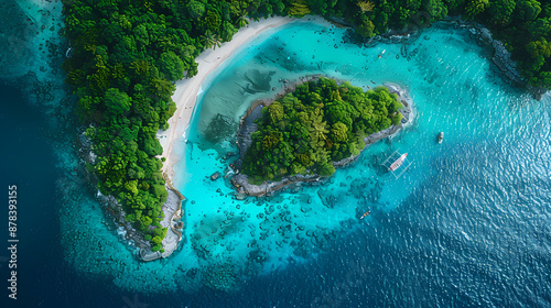 Drone view of a picturesque island with white sandy beaches, turquoise waters, and a coral reef surrounding it, making it a perfect paradise for nature lovers and vacationers