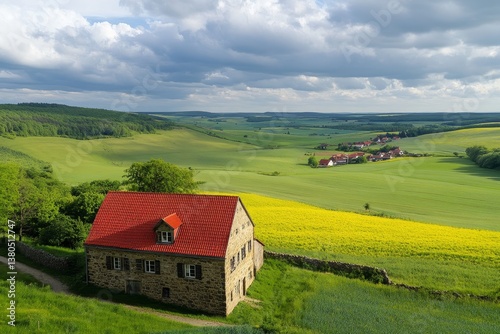 german, farmhouse, old, red, roof, stone, wall, hill, green, rolling, crop, field, village, distant, drone, view, sunny, day, summer, countryside, rural, landscape, agriculture, scenic, picturesque, idylli, peaceful, tranquil, serene, historic, traditional, architecture, building, structure, house, dwelling, residence, farmland, meadow, pasture, sky, cloud, nature, environment, horizon