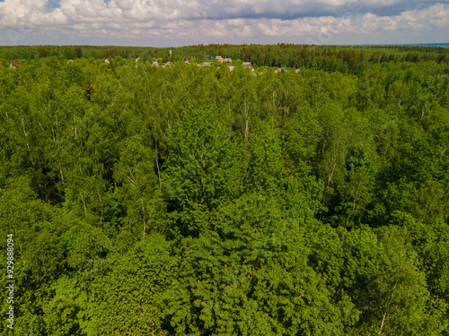 Drone view of the forest and fields, top view and blue sky on a sunny summer day
