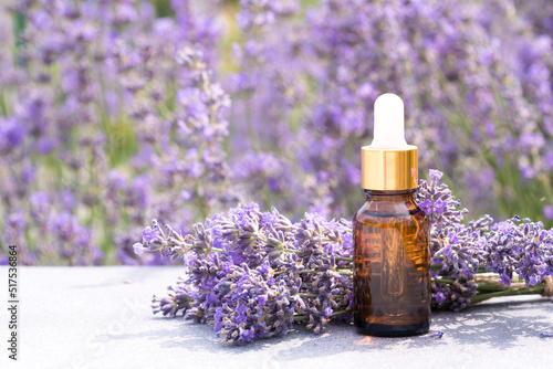 Dropper bottle with lavender cosmetic oil or hydrolate against lavender flowers field as background with copy space. Herbal cosmetics and modern apothecary concept. Lavender essence