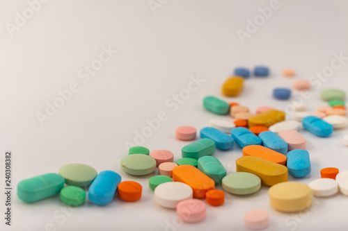 Drugs in the form of medicines. Capsules and tablets of various colors and shapes for human use.