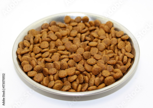 Dry balanced food for cats or dogs in a metal bowl on a white background.