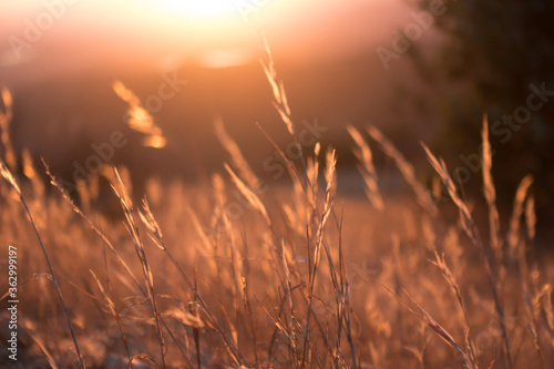 Dry blades of grass are seen in a dreamy photo taken at sunset on Potato Mountain in Claremont Wilderness Park near Los Angeles, California