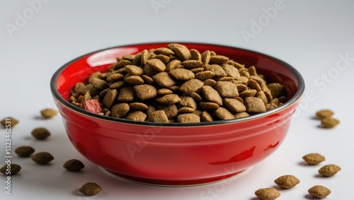 Dry cat food in a glossy red bowl centered on a white background with scattered kibble, ideal for text overlay and design placement.