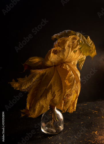 Dry maple leaves of yellow color in a vase on a 2D background with a ray of sun. Golden autumn concept.