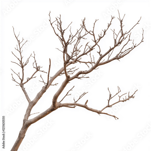 Dry tree branch isolated on a white background with artistic composition. Single bare tree branch photographed isolated against a plain white background in detail.