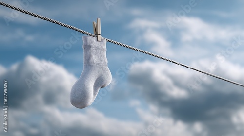 sock, clothes line, drying, laundry, cloudy, sky, white, metal, wire, breezy, simple, life, domestic, hanging, textile, fashion, accessory, casual attire, setting, nature, sunlight, minimalism, decor, everyday, household, chore, fabric, fresh, air, clean, cloud, blue, bright, care, mundane, wind, tidy, organised, freshness, exposure, calmness, home, simplicity, day, clothespin, background, lifestyle, rural