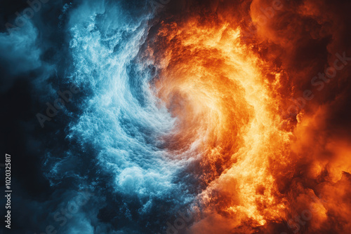 fire, ice, clash, element, opposing, force, balance, dynamic, energy, conflict, high-coloured, colourful, contrast, nature, abstract, swirl, blue, orange, power, heat, cold, fiery, glacé, dramatic, tension, art, design, storm, turbulence, chaos, harmony, hot, cool, temperature, intense, striking, detailed, flames, snow, smoke, fluidity, visual, mesmerizing, texture, pattern, symmetric