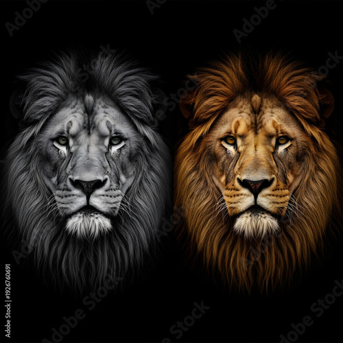 lion, duality, black, gold, portrait, animal, mammal, wildlife, nature, felino, zoology, art, photo, editing, contrast, yin and yang, symbolism, strength, majesty, wild, ferocious, beauty, intense, eye, mane, black-and-white, gold, dark background, monochrome, colourful, juxtaposition, harmony, balance, power, pride, serengeti, savanna