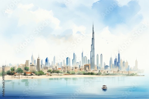 architecture, city, landscape, building, city landscape, illustration, watercolor, nature, art, watercolor, outdoors, painting, drawing, scenery, vignetting, travel, cloud, dubai, ocean, water, body, sea, sky, downloadable, panoramic, graphic, office, white, blank space, skyscraper, isolated, lighting, skyline, tower, metropolis, copy space, horizon, natural, tour tourism, vehicle, urban, full, town, day