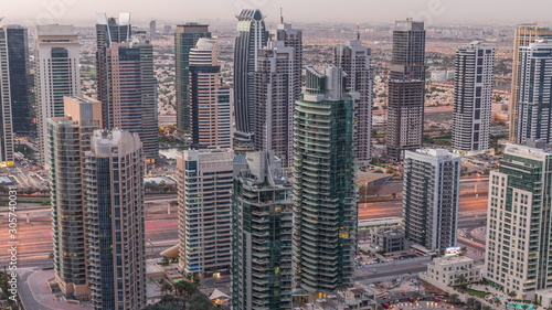 Dubai Marina skyscrapers and jumeirah lake towers view from the top aerial night to day timelapse in the United Arab Emirates.
