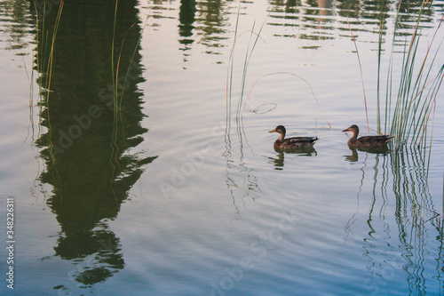 water, lake, nature, grass, duck, river, duck pond, green, bird, blue, landscape, swamp, reed, summer, marsh, wave, plant, sea, calm, sky, tree, family, 2, pair
