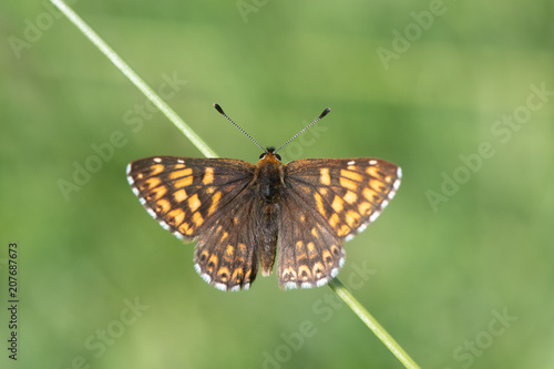 Duke of Burgundy fritillary butterfly (Hamearis lucina) from above. Upperwings of male insect in the family Riodinidae, perched on grass and basking in sun