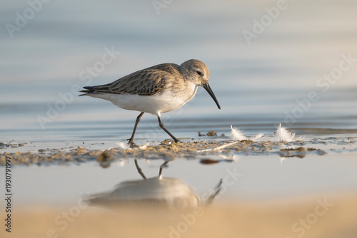 Dunlin - Calidris alpina foraging along the shoreline of Khawr Ad Dahariz, Salalah, Oman. This wader is captured in soft light, showing its characteristic down-curved bill and reflection.