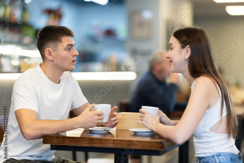 During lunch break, girl at cafe drinking coffee, talks with boyfriend, spends time in company of colleague. Meeting on neutral territory, discussing personal and business issues