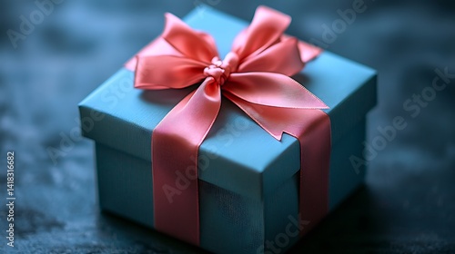 Dusty blue gift box with pink ribbon.