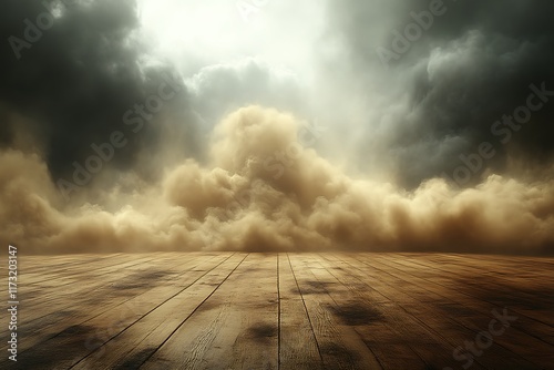 dust, cloud, storm, sand, wind, desert, floor, wood, plank, brown, dark, grey, light, sky, dramatic, atmosphere, background, texture, scene, landscape, environment, moody, ominous, mystical, abstract, apocalyptic, aethereal, fantasy, power, nature, weather, air, particle, haze, fog, gloomy, sandy, earthy, horizon, huge, expanse