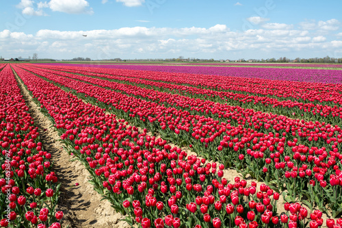 Dutch landscape, colorful tulip flowers fields in blossom in Zeeland province in april