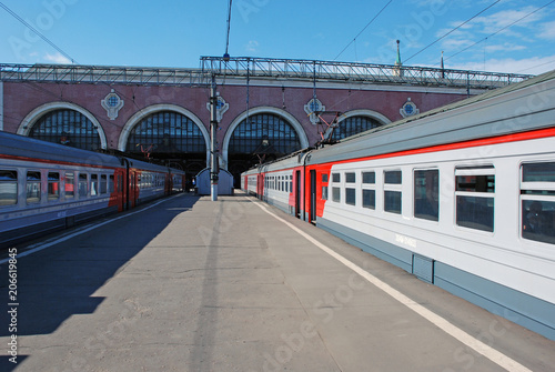 Два электропоезда стоят у платформы Казанского вокзала