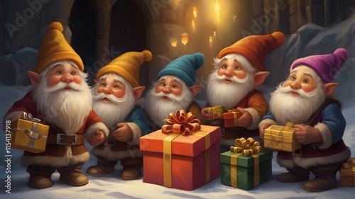"Dwarves with presents and colorful hats."
