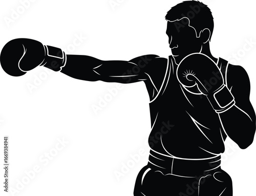 boxing, sport, silhouette, athlete, fighter, training, exercise, strong, strength, fitness, physical exercise, gym, punch, fight, action, power, competition, combat, martial, art, male, man, person, isolated, vector, illustration, graphic, design, healthy, lifestyle, well-being, wellness, black, white, background, contest, energy, muscular, tough, intense, competitive, challenge, determination, discipline, motivation
