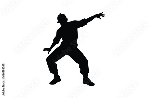 breakdance, dancer, dancing, hip hop, hip hop, performer, performance, movement, motion, energy, style, stylish, cool, young, youth, man, male, person, people, silhouette, black, white, isolated, vector, illustration, graphic, design, art, pose, action, dynamic, cap, hat, arm, leg, full body, modern, contemporary