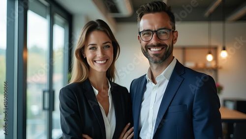 Dynamic Business Leadership: Male and Female Managers Showcase Teamwork and Success in Office Photo