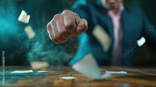 Dynamic Business Power: Assertive Fist Punches Through Flying Paper in Office Setting