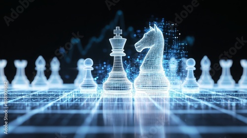 chess, queen, knight, move, strategy, decision, game, dynamic, motion, glowing, blue, pastel, aglow, trail, stock exchange, graph, finance, decision-making, dominance, power, competitive, leadership, bold, strategic, intelligence, tactic, game piece, chessboard, victory, action, business, market, stock, trading, financial, technology, growth, analysis, risk, competition