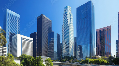 Dynamic city skyline with modern skyscrapers representing a thriving business district, showcasing economic growth and opportunities under a clear blue sky