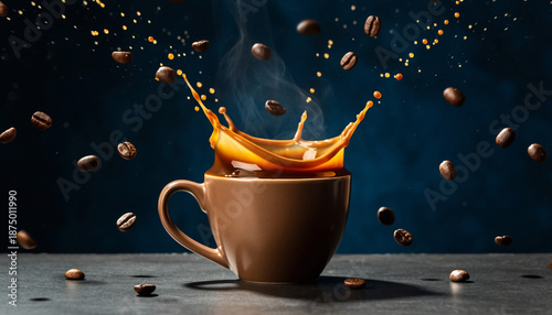 Dynamic coffee splash with flying roasted beans in brown mug.