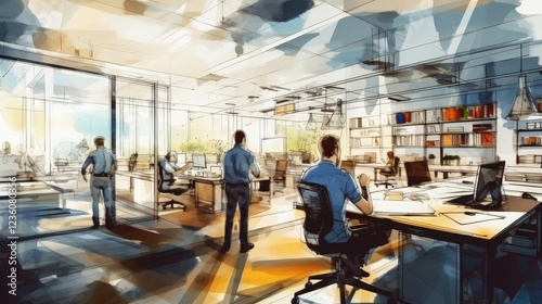 office space, interior design, workstation, productivity, office furniture, contemporary, sunlight, professional, employee, designer, sketch, organisation, planning, efficiency